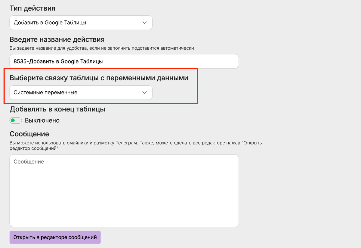 Как настроить поиск в Google Таблицах по переменным и системным данным через BOTM.PRO