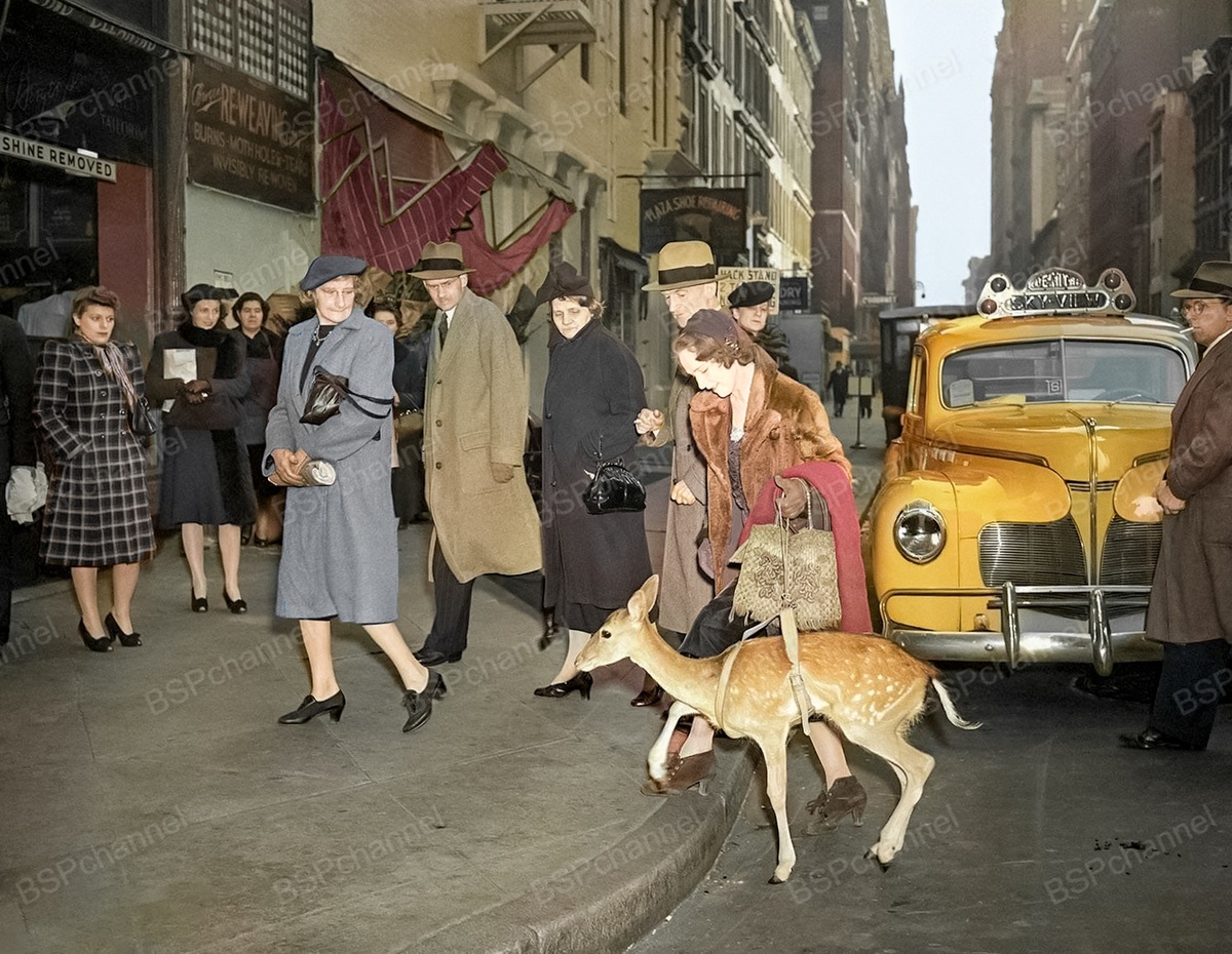 Удивленные зрители с изумлением наблюдают, как мисс Бет Питт выгуливает своего любимого оленёнка по кличке Стар Мессэдж в центре Нью-Йорка 16 ноября 1942 года.