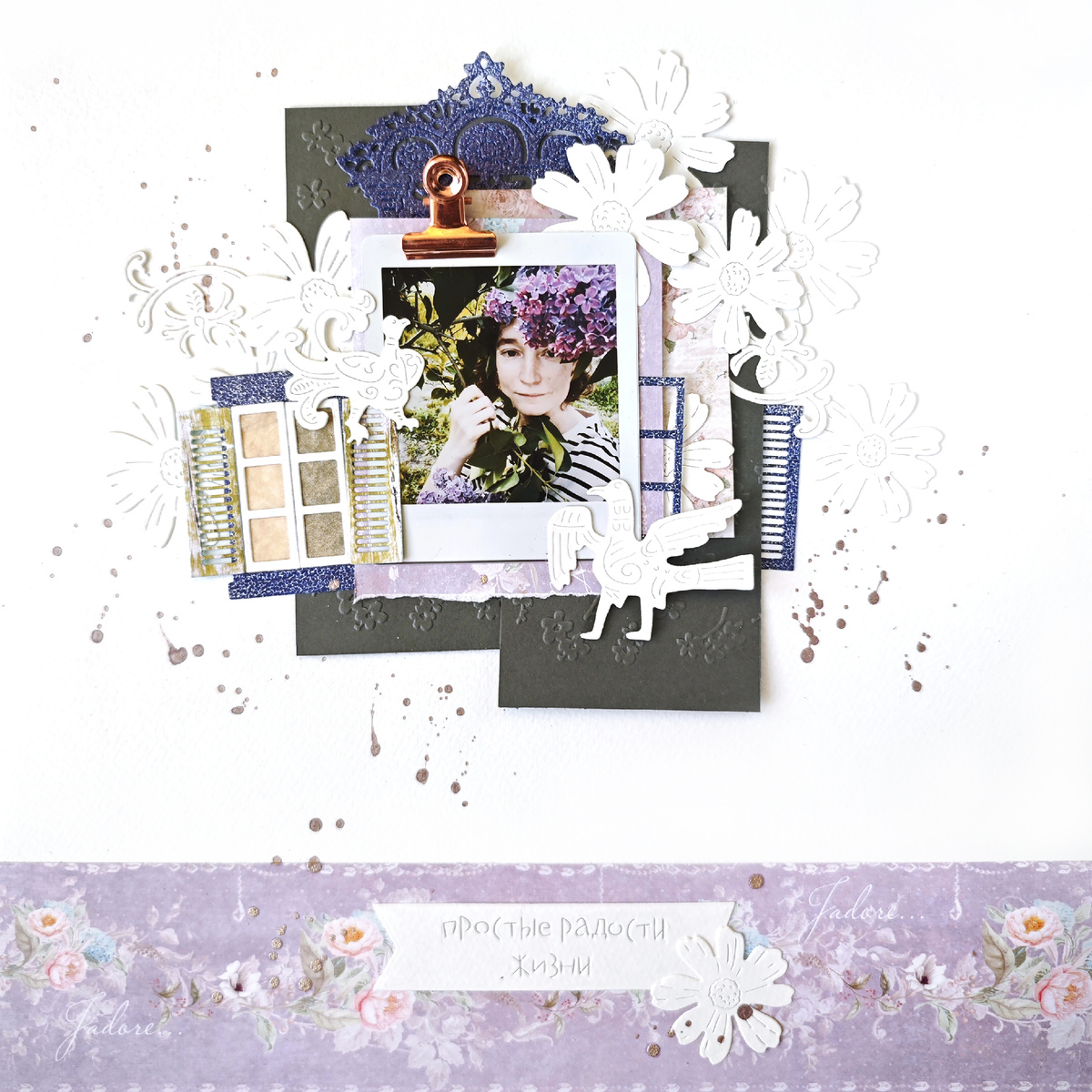 Привет! С вами Надя )) У меня сегодня цветочное настроение )) Как круто сочетаются "Космеи скромные цветы" и "Страдающее средневековье"! Добавила фактуры папкой "Незабудки", окно и ставеньки "Распахни настежь окна", надпись "Слова для души". А резные наличники новенького сета "Расцвела под окошком" - из них получается ррроскошная рамка для фото! Добавила брызги краски-хамелеона, немного магии и все готово ))