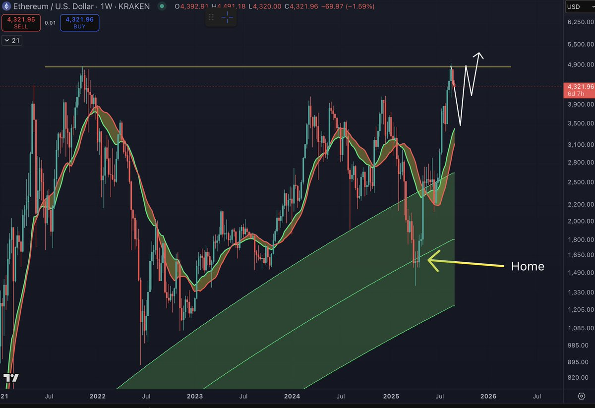 Мне кажется, что многие инвесторы сейчас живут в иллюзии: раз ETH пробил прежний ATH в августе, значит дальше только космос. Но если честно, рынок любит проверять терпение — и чаще всего после такого забега мы видим возврат к 21-недельной EMA. Я вспоминаю похожие ситуации в прошлых циклах: всегда одно и то же — сначала эйфория, потом резкая проверка на прочность. Это как ритуал жадности: толпа заходит на хаях, а рынок делает вид, что их «высаживает» — возвращается к базовой линии тренда. В этот раз линия совпадает с 21W EMA. Помните, мы уже обсуждали в постах про «дом» для ETH — зону, откуда монета начала новый рост в апреле. Сейчас план выглядит очень логично: новый ATH → откат к 21W EMA → поиск поддержки. Да, это может выбить слабые руки, но именно так строится устойчивый бычий рынок. Что это значит? Для долгосрочных игроков ничего катастрофичного. Это обычная фаза цикла, где рынок выдыхает, чтобы потом продолжить рост. Для трейдеров — психологическая мясорубка, потому что будет мног