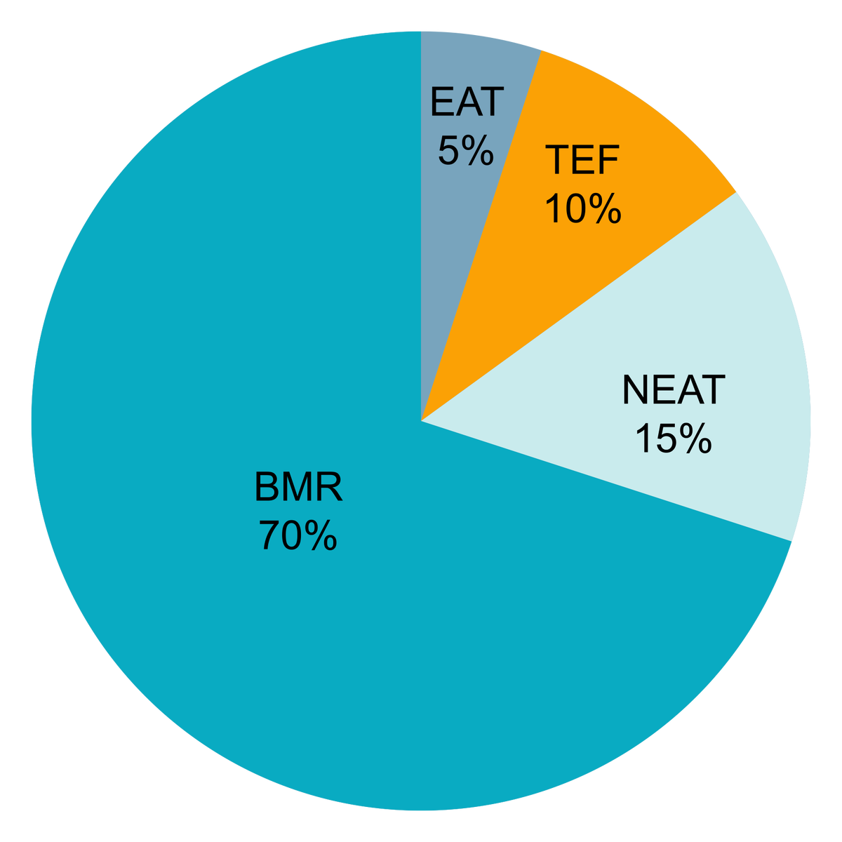 TEF —Термогенный эффект пищи: энергозатраты на переваривание, усвоение пищи ~8–10% от калоража. EAT — тренировки и спорт в среднем 5–10% от суточной активности. Тренируются люди в среднем час, а двигаются 14–16 часов. Даже с учетом интенсивности, трениро