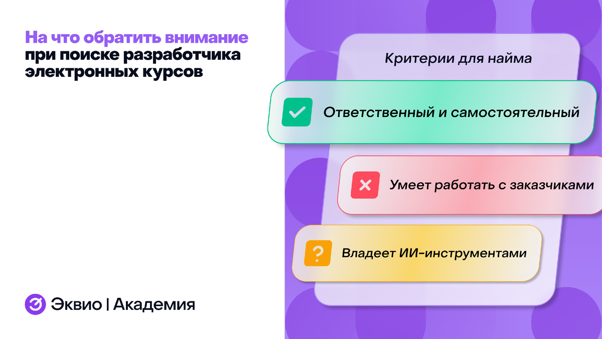 А если вы хотите повысить уровень сотрудников или самостоятельно освоить эту профессию, пройдите курс «Разработчик электронных курсов» от Академии Эквио».