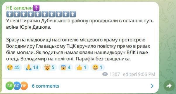 В Ровенской области вручили повестку священнику, проводившему отпевание погибшего бойца ВСУ, сообщил ранее мобилизованный священник Иоанн