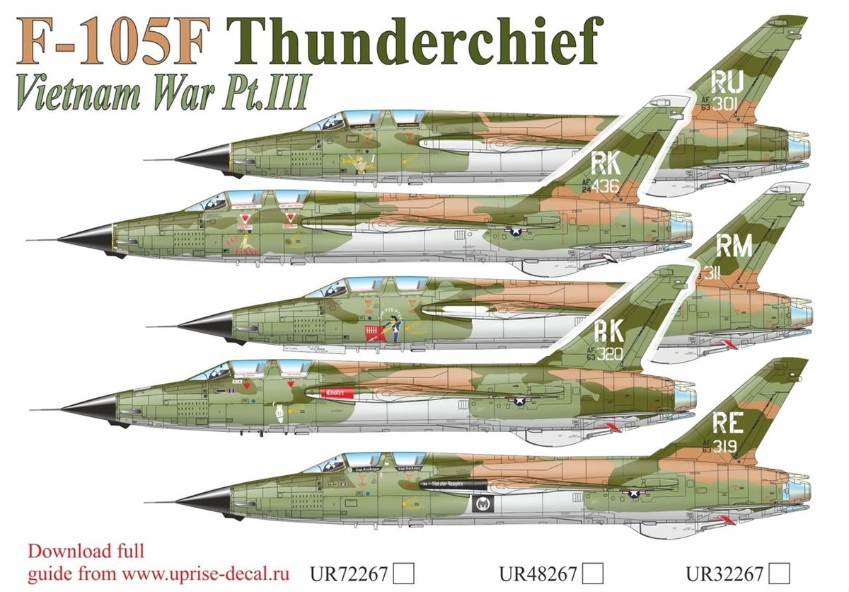 Санкт-петербургская Uprise Decal выпустила по технологии FFA (с удаляемой лаковой подложкой) третью часть декали на двухместные F-105F Thunderchief из Вьетнама в масштабах 1/72, 1/48 и 1/32 (на фотографиях).