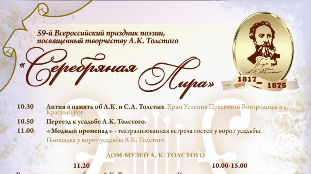Музей-усадьба Алексея Константиновича Толстого в брянском селе Красный Рог 6 сентября станет местом проведения 59-го Всероссийского праздника поэзии «Серебряная лира», посвященного творчеству поэта, писателя и драматурга. По традиции в 10:30 в церкви Успения Пресвятой Богородицы на въезде в село состоится лития, гости праздника возложат цветы к усыпальнице Алексея Константиновича и Софьи Андреевны Толстых.