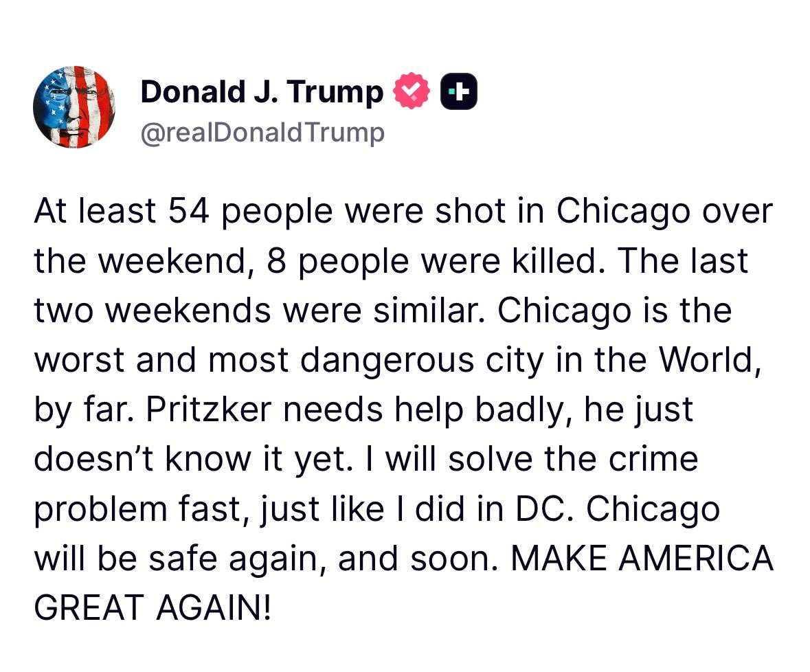POTUS is FURIOUS over Chicago shootings — calls it the WORST and most dangerous city in the WORLD ‘I will solve the crime problem fast, just like I did in DC’ National Guard Humvees to hit streets soon?