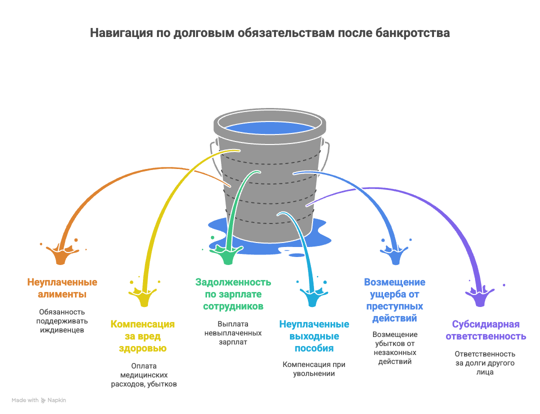 Представьте, что вы находитесь в долговой ловушке: кредиты, микрозаймы, коммунальные, налоги. Интернет обещает золотой ключик: «подай заявление и забудь». Но реальность жестче. Закон определяет: за алиментами, компенсацией вреда здоровью, зарплатами сотрудникам, выходными пособиями, ущербом от преступлений и субсидиарной ответственностью, убытками по грубой неосторожности и недействительными сделками придётся платить даже после процедуры. Эти платежи как якоря — они не отпустят, сколько бы вы ни ждали. Люди часто говорят: «Мне же спишут всё? Я смогу забыть про алименты?» Нет. Алименты — это забота о ваших детях; закон защищает их, и даже банкротство не избавит от обязанности платить. То же с вредом здоровью: если вы кому-то причинили травму, компенсация останется. Зарплаты вашим сотрудникам? Не уйдут. Даже выходные пособия, долги по штрафам за преступления и убытки от грубых ошибок останутся. Не рассчитывайте, что «магическая палочка» уберет всё: есть вещи, которые нужно отработать.