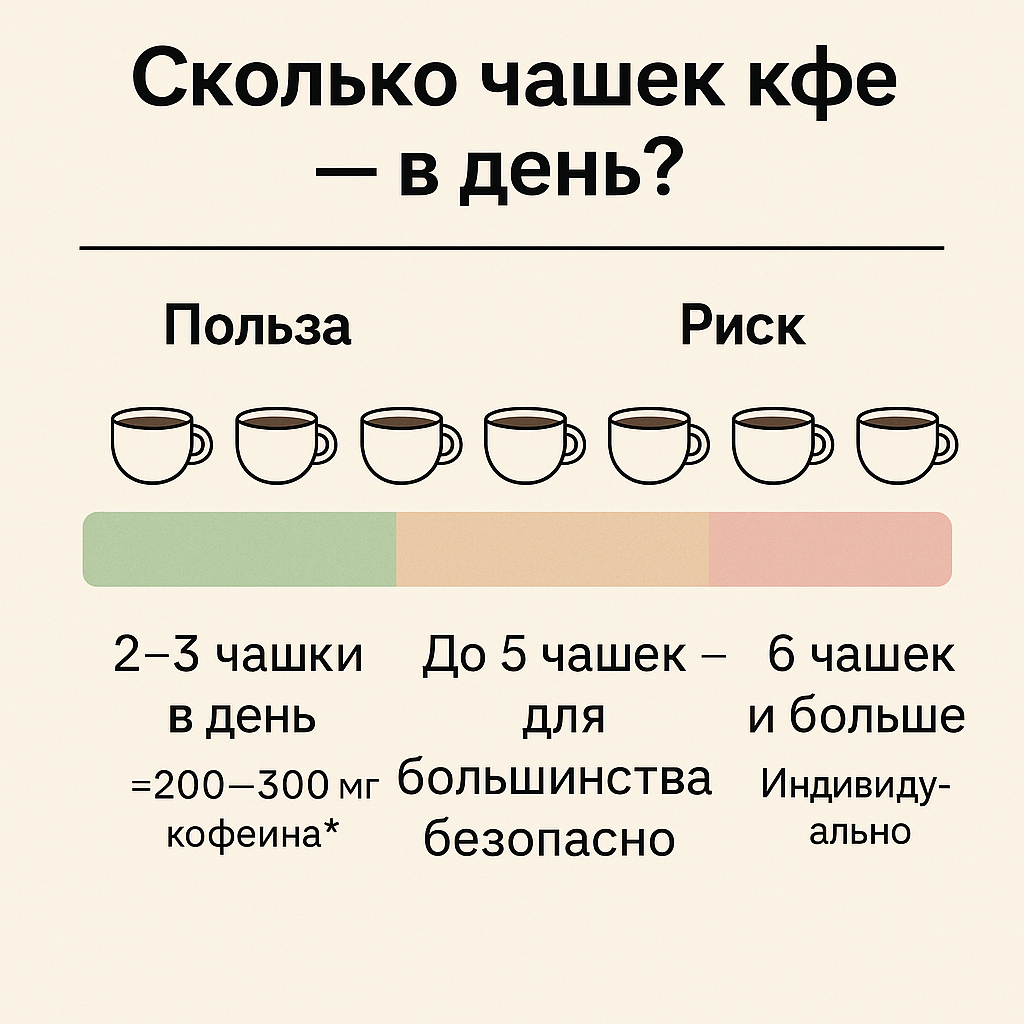 - Оптимум: 2–3 чашки (200–300 мг кофеина).