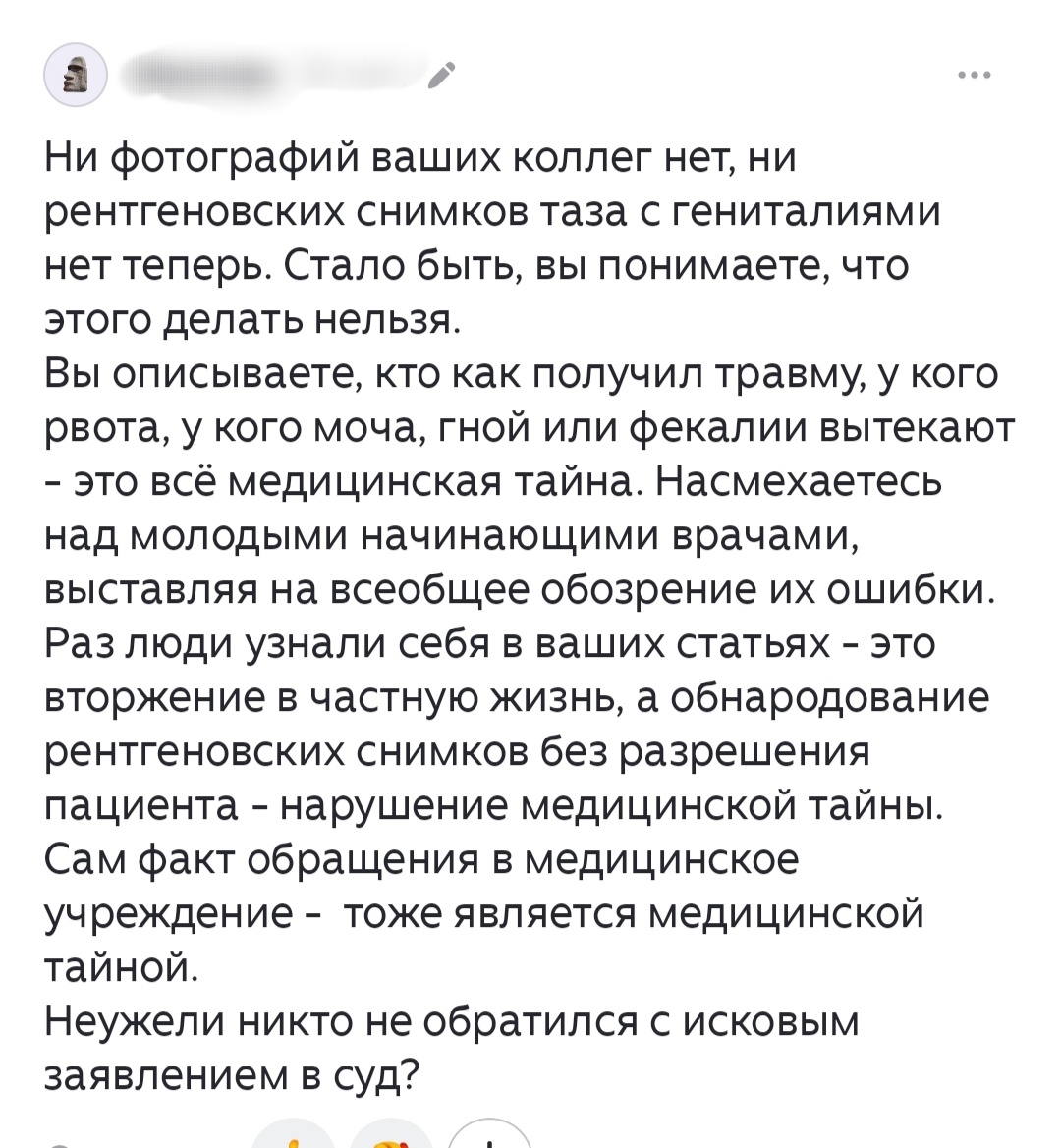 Тут уже без "здравствуйте". Как обычно , по пунктам: 1. Коллег мнимых на моих снимках и не было , но , жаждущие погреться в лучах славы и их нашли. Чтош(имеющий глаза , да увидит и прозреет. 2. Рентгеновские снимки таза , как с гениталиями , так и нет легко ищутся через яндекс картинки. Но Иванова , наверное , только инет открыла. Кто и что для нее поисковик? Иллюстративных фото–масса, да и у любого рентгенолога их много, поделиться попросить–не вопрос. 3. Можно , все можно , и фото выкладывать обезличенные в том числе. Очень плохо , что Иванова не прочитала закон изначально. А я прочитала , стало быть , понимаю , что можно. 4. Кто как получил травму и у кого что вытекло не является медицинской тайной без указания полных данных пациентов. Да они , собственно и не нужны. 5. Насмехаюсь над врачами? Или комментирую процесс? Дифференцировать нужно. Очень сама переживаю , что с первого раза что-то не получается у них, но , так бывает. 6. Раз кто-то , не люди , а подчеркну, КТО-ТО себя узна