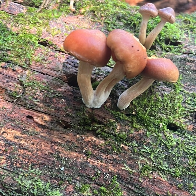 На изображении представлены грибы, которые очень похожи на опенок зимний или фламмулина бархатистоножковая [Flammulina velutipes]. Грибы растут сростками на пне, что характерно для опят. Шляпки у них рыжевато-коричневые, глянцевые, что тоже совпадает с описанием фламмулины. Ножка у грибов светлая, бархатистая у основания, что является еще одним отличительным признаком этого вида. Опёнок зимний, фламмулина бархатистоножковая [Flammulina velutipes] — это пластинчатый гриб, который часто растет группами на мертвой древесине лиственных пород деревьев, особенно в холодное время года, даже под снегом. Шляпка у него выпуклая, со временем становится более плоской, диаметром от 2 до 10 см, окрашена в желтовато-оранжевые, медово-желтые или рыжевато-коричневые тона, часто более темная в центре. Поверхность шляпки гладкая, липкая и блестящая во влажную погоду. Пластинки редкие, приросшие к ножке или свободные, белые или кремовые, со временем могут пожелтеть. Ножка длиной 3-10 см, тонкая, цилиндрич