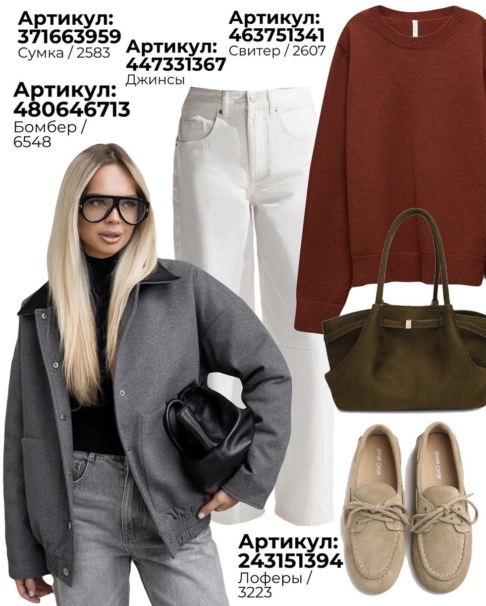 База и цвета: теплый кирпично-терракотовый свитер + молочные джинсы + серый бомбер-рубашка. Акценты — оливковая сумка и песочные лоферы. Палитра спокойная, дорого смотрится за счёт контраста «тёплый/холодный» и игры фактур.