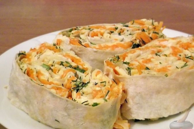 Ингредиенты: ⚫Лаваш - 4 листа ⚫Майонез - 200 г ⚫Морковка корейская - 300 г ⚫Сыр - 200 г ⚫Зелень укропа - 1 пучок ⚫Зелень кинзы - 1 пучок Приготовление: На крупной терке потереть сыр. Укроп и кинзу нарезать. Разложить первый лист лаваша. Дальше нужно будет раскладывать начинку. Делать это нужно оперативно, чтобы нижний лист лаваша не размок. На лист лаваша намазать майонез (3-3,5 ст. ложки). Разложить 1/3 натертого сыра (65 г). Посыпать корейскую морковку (тоже 1/3, то есть 100 г_) . Притрусить зелень (1/3 от общего количества). Закрыть вторым слоем лаваша. Проделать то же самое, то есть распределить по поверхности еще 1/3 майонеза и 1/3 начинки. Повторить так три раза, сверху положить лаваш. Лаваш с морковью по-корейски закатать в рулет, положить в холодильник и дать ему пропитаться (30-40 минут). Затем нарезать рулет с морковью по-корейски кусочками примерно 1,5 см (наискосок или ровно - как вам больше нравится). Выложить получившиеся кружочки на блюдо. Лаваш с корейской морковкой