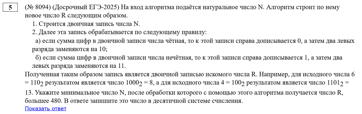 Задача с сайта Полякова К.Ю. Досрочный ЕГЭ-2025 Теория по работе с заданием без написания алгоритма: Строится двоичная запись числа N bin(123) # 123 из десятичной системы счисления переводится в двоичную (0b - обозначение двоичной системы при выводе) Разряды - это цифры двоичного числа. 1000110 - два левых разряда 1000100 - два правых разряда и так далее Перевод из двоичной системы счисления в десятичную: int('1010101', 2) # левый аргумент - запись двоичного числа в кавычках, правый - основание системы счисления, откуда переводим Для эффективного решения задачи необходимо внимательно смотреть и анализировать пример, который дан в условии задачи. Например, для исходного числа 6 = 1102 результатом является число 10002 = 8, а для исходного числа 4 = 1002 результатом является число 11012 = 13. То есть: если сумма цифр в двоичной записи числа чётная, то к этой записи справа дописывается 0, а затем два левых разряда заменяются на 10 110 - сумма цифр чётная, значит дописываем 0 1100 два левых