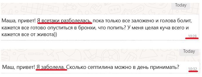 Ну, что? Кто еще заболел сегодня? Утро мое началось с сообщений моих двух подруг о том, что они заболели. С разницей в 4 минуты…(см скрин из вотсапа). Конечно, сегодня в Москве немного холоднее, чем вчера и в воскресенье, но, в целом, это климатическая норма. Почему люди так часто осенью болеют? Мы обычно говорим про детей: они вернулись с каникул, пошли в садик/школу, там встретили вирусы из других мест, привезенные другими детьми, переопылились инфекциями и тд. Но эти дамы давно никуда не ездили. И в метро тоже нечасто бывают. Да, конечно, встречают определенное количество людей на работе. Но дело не в этом. Дело в том, что мы (большинство людей) не соблюдаем правила поведения в сезоны. - Едим одну и ту же еду в разные сезоны, - не ограничиваем себя летом в овощах и фруктах, даже вечером, - продолжаем в жару есть кисломолочные продукты - охлаждаемся ледяными коктейлями и водой из холодильника и т.д. И все это на фоне стресса и большого количества передвижений. И тогда органи