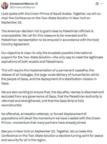 В ответ на пост Macron announces co-chairing conference on Two-State Solution with Saudi Arabia Crown Prince, in New York, Sep 22 Calls on Trump to reverse ban on Palestinian reps attending 'Decisive turning point for peace and security for all in the region'