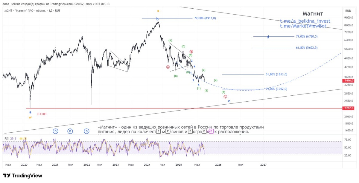 #ПотребСектор_НЕцикличные #MGNT Магнит Движение по Магниту продолжается согласно ожиданиям – падение в волне [c] of c развивается импульсно. Недавний отчет ритейлера оказался хуже ожиданий. Да, мы учитываем покупку Азбуки Вкуса. Но вместе с тем видим существенный рост долговой нагрузки в период высоких ставок. Чистый долг увеличился на 715(!) до 431,6 млрд руб. Это увеличивает нагрузку на обслуживание долга, что отражается на снижение маржи и увеличении мультипликаторов. Думаю, период облегчения для Магнита будет завершение волны [c] of c треугольника – снижение ставки начнет оказывать эффект? Не является ИИР 💪 Бот Закрытого Канала (подписаться из-за границы, пишите личным сообщением