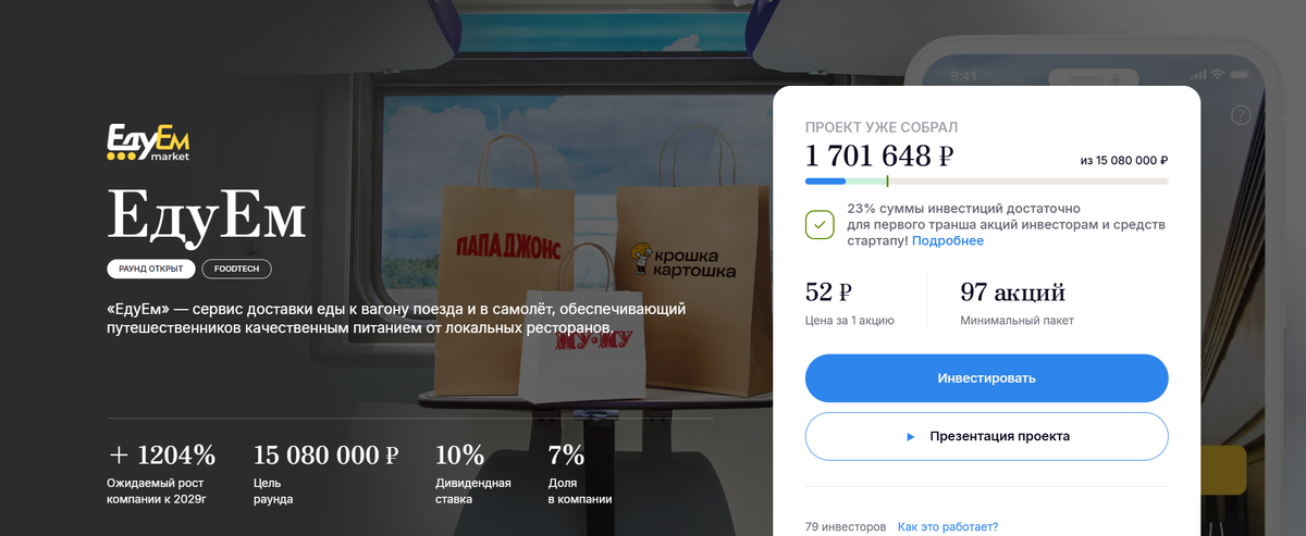 Описание ЕдуЕм гласит - единственный сервис доставки еды в поезда и самолёты, официально работающий и интегрированный с ЖД-станциями и 6 аэропортами. Всё это решает проблему ограниченного выбора питания в путешествиях, предлагая заказать любую еду за 2 минуты через приложение.