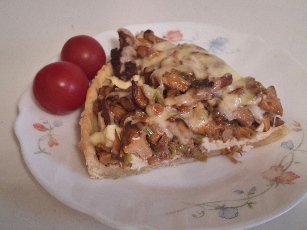 ПЕСОЧНЫЙ ПИРОГ С ЛИСИЧКАМИ, БЕКОНОМ И ЛУКОМ ПОРЕЙ. Открытый пирог с грибами и сыром.