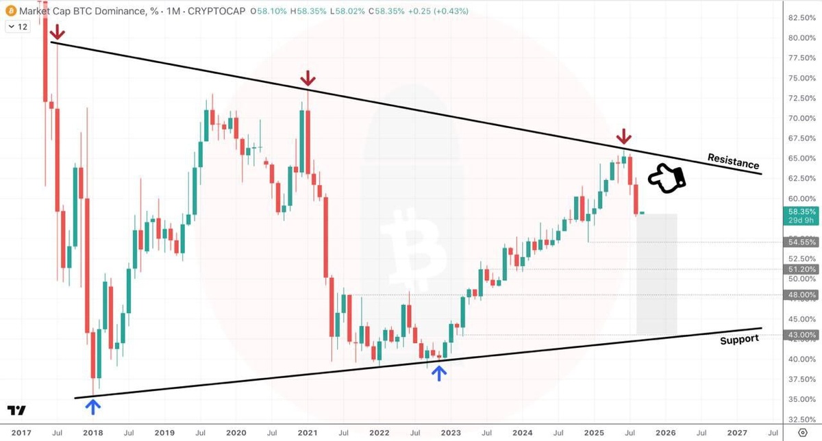Ранее мы писали о том, что ждем доминацию Биткоина в район 45%, а ниже еще одна западная аналитика с целями еще ниже наших, но в целом прогноз одинаковый: $BTC.D график 1М Две толстые красные месячные свечи. Явное изменение тренда 📈📉 #BTC осталось сделать последний более высокий максимум, и $BTC.D собирается ускориться вниз 📉 Знаете, что это значит для $Alts 😌