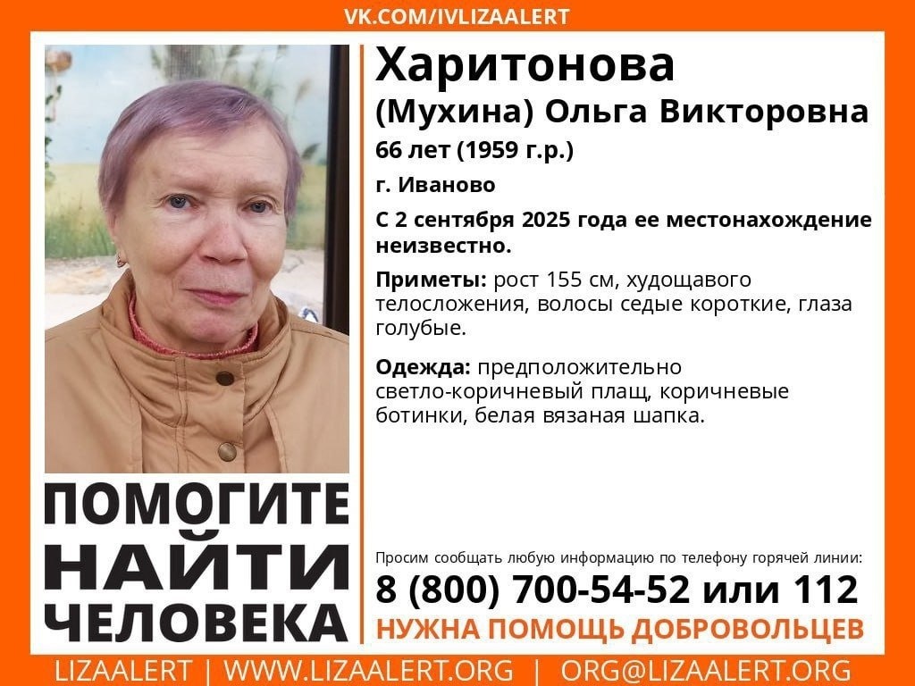 В Иванове пропала 66-летняя женщина Поисковый отряд «Лиза Алерт» просит помощи в розыске Ольги Викторовны Харитоновой (Мухиной). 66-летняя ивановка пропала 2 сентября. Приметы: рост 155 см, худощавого телосложения, волосы седые короткие, глаза голубые. Была одета: предположительно светло-коричневый плащ, коричневые ботинки, белая вязаная шапка. Любую информацию можно сообщить по телефону горячей линии 8 800 700 54 52 или 112.