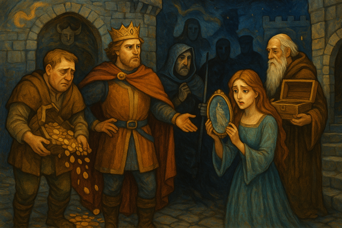 Сказочный Козерог — это старец, который карабкался на гору ради золота. Но, достигнув вершины, он увидел пустой сундук. Его глаза открылись — и он понял, что золото было иллюзией, а истинное богатство осталось внизу.