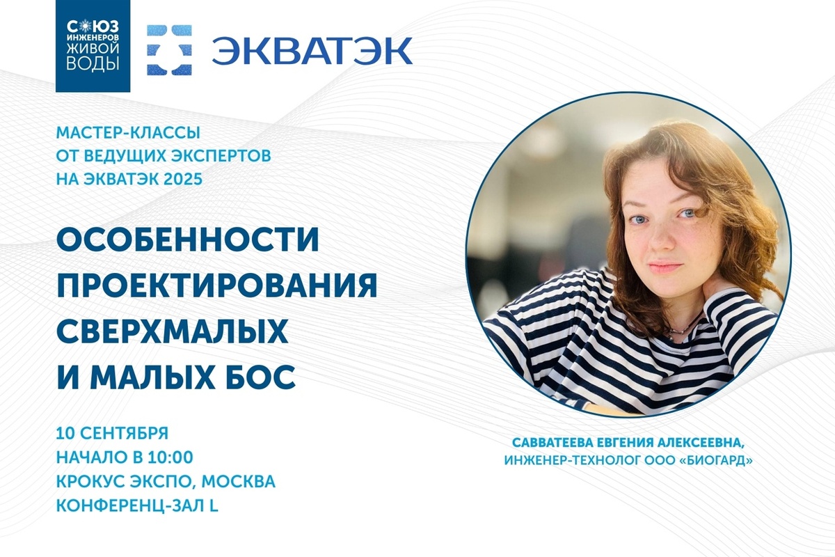 Союз ИЖВ на сцене ЭкваТэк Про "Водный код будущего" и стенд 8С2 мы уже много рассказали, а как же выступления на форуме ЭкваТэк? Их есть у нас тоже! 10 сентября в рамках программы мастер-классов от ведущих экспертов отрасли свой доклад представит Савватеева Евгения Алексеевна, кандидат технических наук, инженер-технолог компании "БИОГАРД" и модератор встреч Книжного и Дискуссионного клубов Союза Инженеров Живой Воды. Тема: Корректные подходы к проектированию и эксплуатации малых КОС для достижения требуемого качества очищенной воды. Проблемы недостижения качества и их решения. Из доклада мы узнаем о разнице в подходах к проектированию КОС до и более 1000 куб. м в сутки; о том, на что нужно обратить особое внимание, и чем можно пренебречь (спойлер: на все и ничем 😅); о личном опыте борьбы Евгении Алексеевны с различными ситуациями и проблемами при эксплуатации сверхмалых КОС (вспухание, ИПС, перебои с расходом, простои при отключении электроэнергии и прочее); о повышении производи