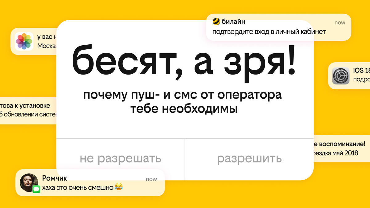 Мы привыкли, что пуши — те самые маленькие рекламные сообщения, вылезающие на экран смартфона, — чаще раздражают, чем помогают. Один магазин поздравил с Днём огурца, второй снова и снова зовёт на распродажу… Однако пуши и смс от мобильного оператора — совсем другое дело. Рассказываем, зачем они нужны, как настроить и почему их не стоит игнорировать. Пуш-уведомления — это всплывающие сообщения, которые приходят от приложений. Например, Билайн пишет в пушах клиентам: В отличие от смс, пуш-уведомления приходят мгновенно и не теряются в общем списке — ты за секунду видишь их на экране. А значит, быстрее сможешь отреагировать — ответить сотруднику поддержки или выбрать тариф выгоднее, пока акция не закончилась. Если уведомлений становится слишком много — их легко отключить или отфильтровать в настройках смартфона и оставить только самое важное. И вовсе необязательно злиться. Смс — надёжный способ получить информацию, ведь приходят они даже при слабом сигнале. По смс мы отправляем: А ещё ты