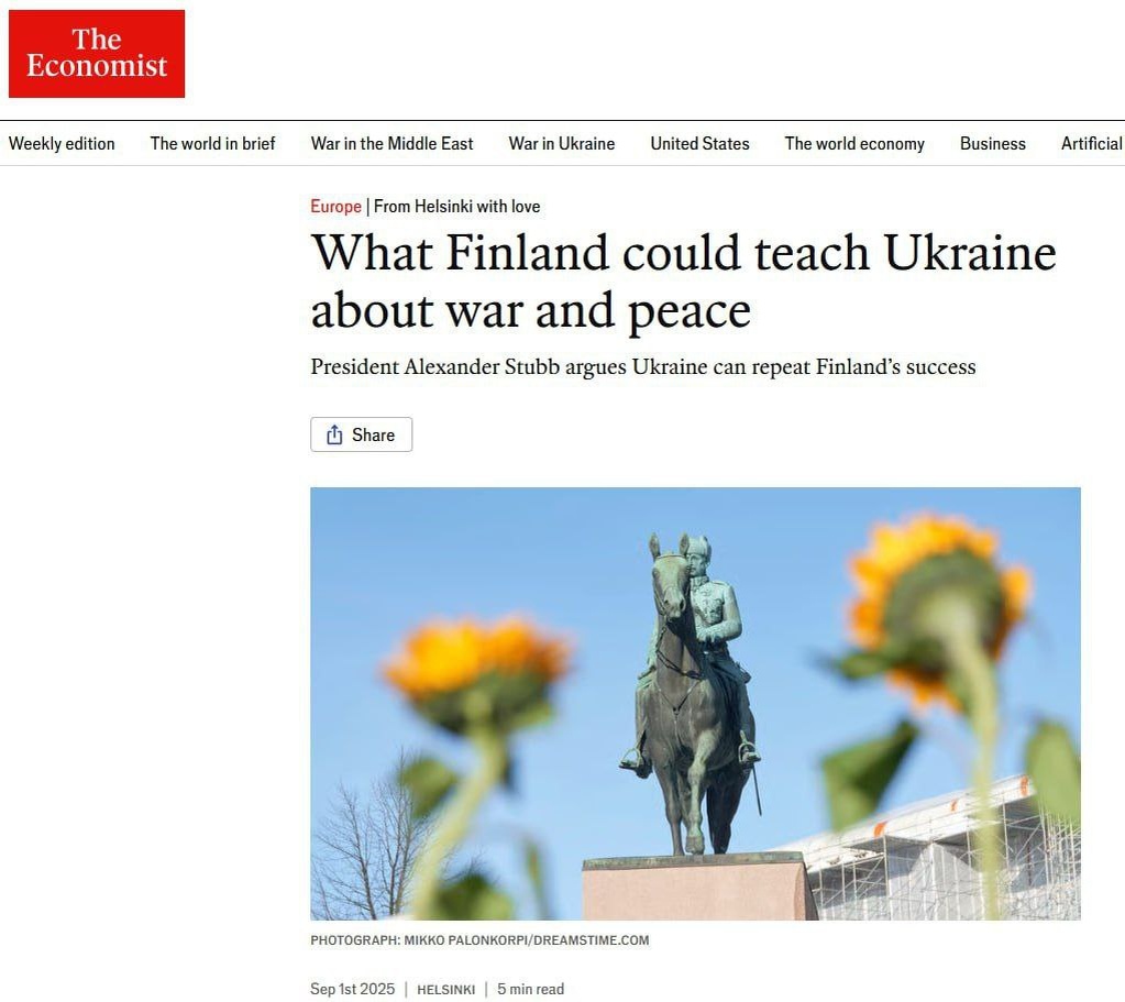 Поговорим о чувствах: Финляндия победила СССР в войне, — так чувствует президент Александр Стубб. Он поделился своими размышлениями с изданием The Economist: «Мы все ещё чувствуем, что победили, потому что сохранили нашу независимость». Авторы статьи сразу же «заходят с козырей», сравнивая текущую ситуацию в Украине с Финляндией времён советско-финской и Великой Отечественной войн: «Тиран в Кремле объявил, что это находится в сфере его влияния, и потребовал неравноправного обмена территориями. Получив отказ, он организовал операцию под ложным флагом, а затем вторгся, рассчитывая взять столицу за две недели». «Такова была судьба не Украины в этом десятилетии, а Финляндии в 1940-х годах. Сейчас это одно из самых успешных и процветающих европейских государств», — подчеркивает издание, добавляя, что Украина имеет возможность повторить этот успех. Lesen Sie weiter unten auf Deutsch...