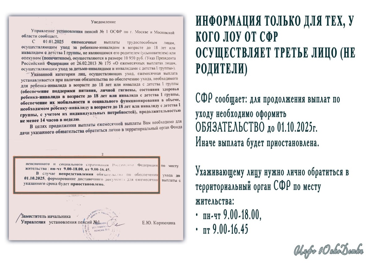 Уважаемые родители, информация только для тех, у кого ЛОУ от СФР осуществляет третье лицо (не родители). В связи с изменениями в правилах ежемесячных выплат трудоспособным лицам, осуществляющим уход за детьми-инвалидами и инвалидами с детства I группы, если этот уход осуществляет не родитель (усыновитель) или опекун (попечитель), необходимо оформить ОБЯЗАТЕЛЬСТВО по обеспечению ухода. Оно включает обеспечение: • Поддержки питания, • Личной гигиены, • Состояние здоровья, • Обеспечение мобильности и социального функционирования в объеме, необходимом ребенку-инвалиду или инвалиду с детства I группы, с учетом их индивидуальных потребностей, Продолжительностью не менее 14 часов в неделю. ✔️ СФР сообщает: для продолжения выплат по уходу необходимо оформить ОБЯЗАТЕЛЬСТВО до 01.10.2025г. Иначе выплата будет приостановлена. ✔️ Как оформить? Ухаживающему лицу нужно лично обратиться в территориальный орган СФР по месту жительства: • пн-чт 9.00-18.00, • пт 9.00-16.45. Рекомендуется предва