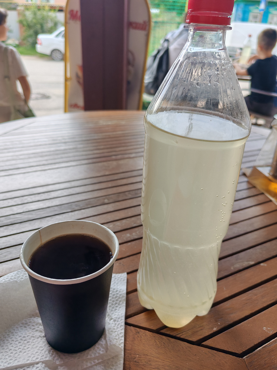 После основной экскурсии по монастырю, о которой я писала здесь: Я отправилась в монастырский буфет купить что-нибудь перекусить и попить. Но выпечка вся закончилась, скупили туристы из Самары, что на теплоходе приезжали. Остался только квас. Я взяла квас с собой и кофе. Кофе, на удивление, был очень невкусный, не допила, выбросила. А вот квас реально хороший, отлично утолял и жажду, и голод. Буфетчица сказала, что через час будет готова вечерняя выпечка. Я решила, что зайду и куплю после похода к поклонному кресту. В буфете я уточнила дорогу к поклонному кресту. Мне объяснили, что нужно от монастыря выйти налево, дойти до дома с синей крышей и синим забором, и там будет дорога, по которой люди ходят. Вот по ней до конца и идти. Вышла я из буфета и, немного пройдя, нашла деревянный дом с синей крышей и синим забором. Нашлась и тропка, по которой люди куда-то шли. Я отправилась в путь и вскоре оказалась на красивой набережной, где вдалеке виднелись лодки и небольшой пляж. Пока я делал