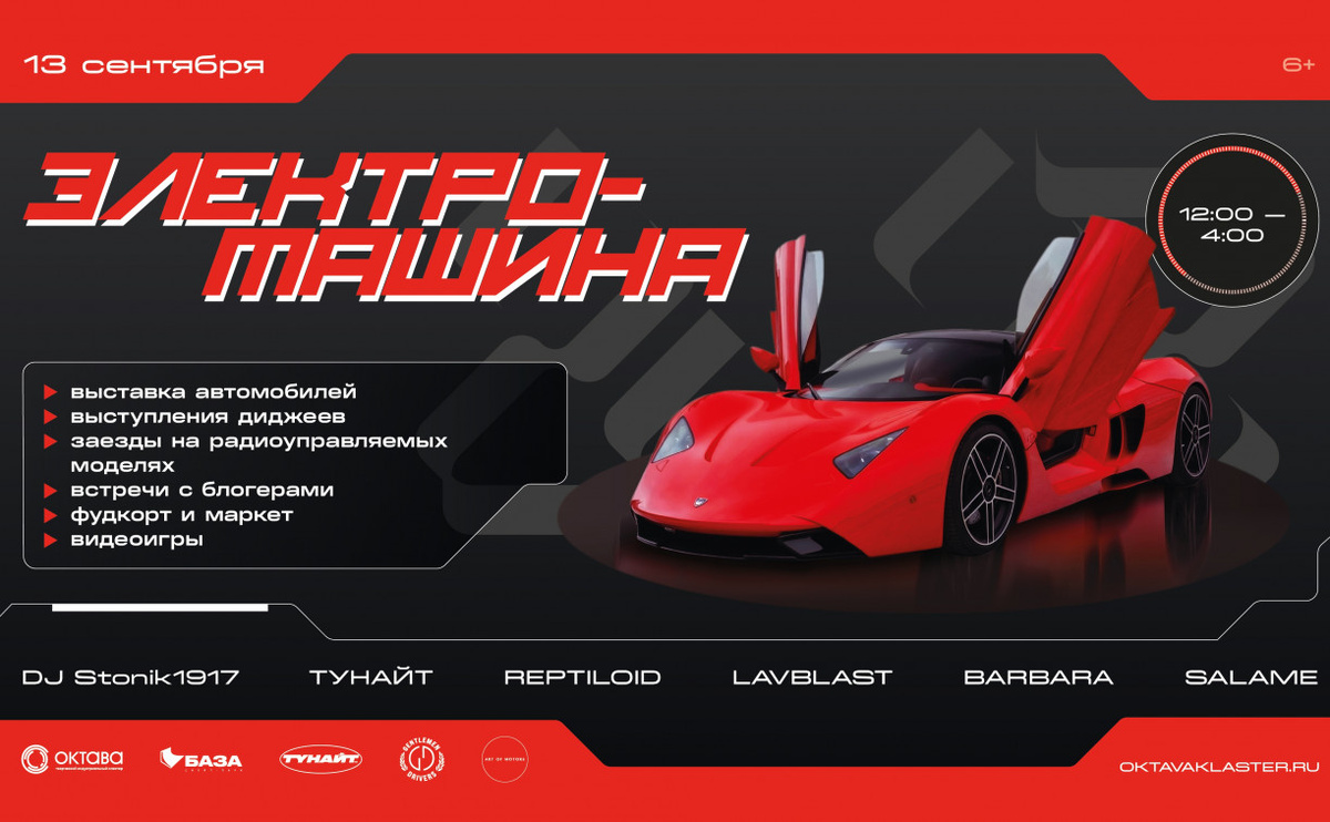 Мероприятие объединит спортивные, ретро- и кастом-автомобили, мини-картинг, зону для автоблогеров, видеоигры, фудкорт и масштабную музыкальную программу. 13 сентября в День города Тулы творческий индустриальный кластер «Октава» станет центром притяжения для всех любителей автокультуры и электронной музыки. Фестиваль «Электромашина» объединит спортивные, ретро- и кастом-автомобили, мини-картинг, зону для автоблогеров, видеоигры, фудкорт и масштабную музыкальную программу. Программа разделена на две части — дневную и вечернюю. Днём до 19.00 вход свободный по регистрации. В течение дня можно посмотреть выставку автомобилей во дворе, стенды автопартнёров и тюнинг-команд, соревнования радиоуправляемых моделей, а также поучаствовать в открытых тренировках от фитнес-центра и экскурсии по автоэкспозиции с куратором — Сергеем Знаемским, ведущим автомобильным журналистом страны (АвтоРевю). В большом зале днём будет организована игровая зона с приставками и гоночными симуляторами. Для поклонников