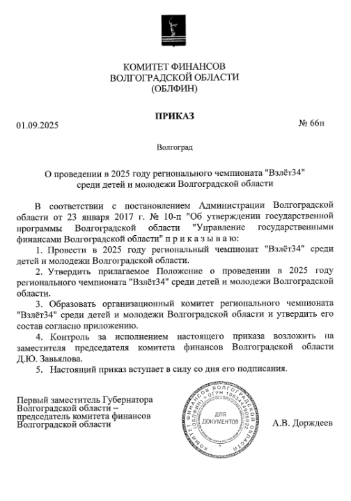 Приказ о проведении чемпионата «Взлет34» появился на сайте обладминистрации сегодня, 2 сентября. Организатором состязаний стал комитет финансов Волгоградской области. Необычное мероприятие пройдет с 18 по 21 сентября.