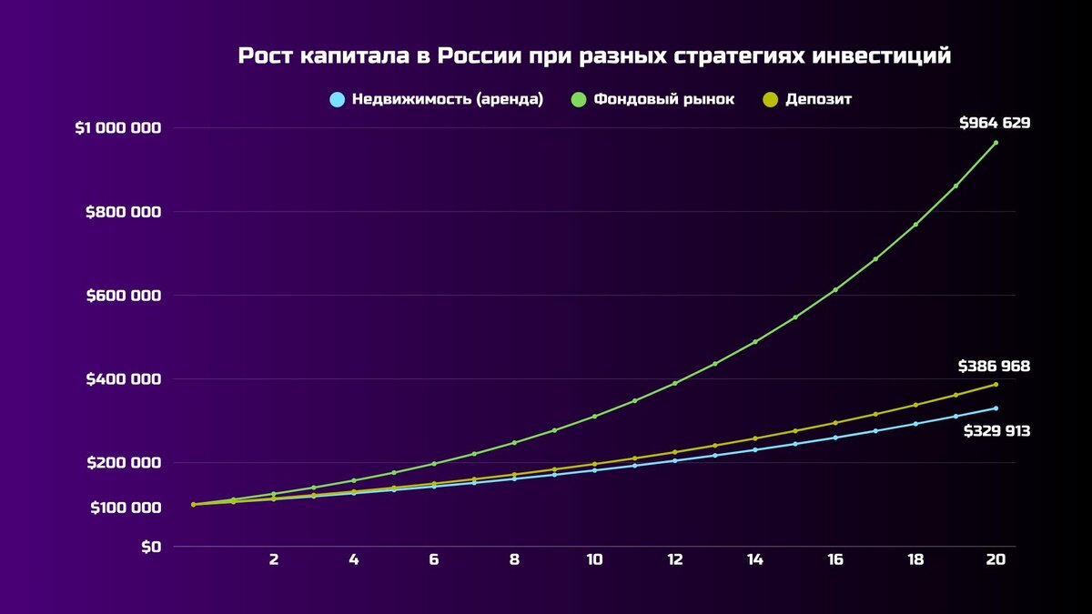 Почему откладывать на пенсию в банке — почти гарантия остаться ни с чем... И почему фондовый рынок реально работает на тебя, а квартиры и вклады — нет. Все привыкли думать: «Сейчас откладываю в банк — через 20 лет пенсия будет обеспечена». Или: «Куплю квартиру, буду сдавать — жить на аренду». Реальность намного жестче. Давай разберём цифры: 🏦Банковские вклады Средняя ставка по рублевым депозитам в крупных банках сегодня — 16–21% годовых. Но инфляция стабильно 10–12% (иногда больше). Фактически твоя реальная доходность — 4–11% в лучшем случае. За 20 лет $100 000 превратятся примерно в $220 000–$330 000. Похоже на подъём по эскалатору, который едет вниз — вроде идёшь вперёд, но остаёшься на месте. 🏠Аренда недвижимости Сейчас средняя доходность сдачи квартиры в России — 6,15% годовых от стоимости жилья. Плюс налоги, ремонт, пустые месяцы без арендатора. За 20 лет $100 000 вложенные в квартиру принесут около $370 000. Риски, хлопоты и низкая ликвидность. 📈Фондовый рынок Историческа