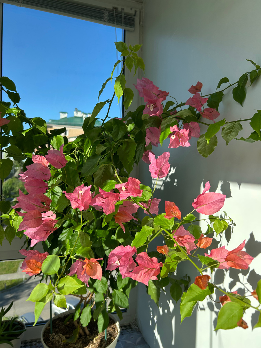 Как долго я ждала ее цветения! И каким прекрасным оно было! Свою бугенвиллию я привезла небольшим растеньицем в горшочке из Сочи в октябре 2022 года. Историю ее появления и все мои не напрасные старания для ее цветения вы можете прочитать в этой статье на канале. О долгом ожидании со счастливым концом я тоже рассказала своим читателям в другой своей статье. И вот моя бугенвиллия, начиная с мая, цветет все лето, не переставая. При этом она не просто цветет, она очень стремительно растет, подтверждая свою принадлежность к лиане. За лето ее побеги выросли до 1,5-2 м, причудливо изгибаясь и занимая отведенное ей одной пространство на южном подоконнике лоджии. За летние месяцы цветение бугенвиллии то усиливалось, то затихало, но оставалось непрерывным. Прицветники (те, что мы называем цветами) появлялись, как правило, на кончиках растущих побегов. Поэтому к концу лета грозди розовых прицветников разметались по разным уголкам широкого подоконника, упираясь в потолок и обвивая п