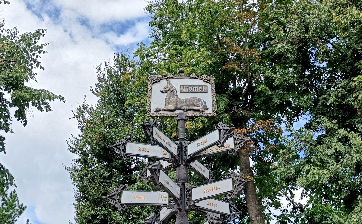 На самое первое фото попал столб с указателями городов-побратимов Гомеля в сквере имени Кирилла Туровского. Отсюда мы начнём наш маршрут. Сверху разлеглась рысь – геральдический символ города, что вписали в городской герб в конце XVIII века, ибо в окрестностях водилось очень уж много рыси.