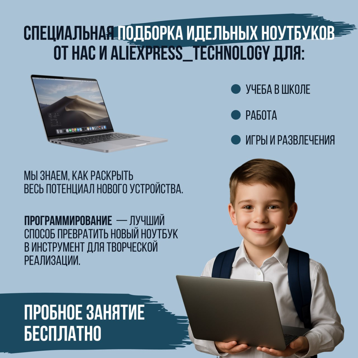 Специальная подборка от нас и AliExpress_Technology! 🤝 Наши друзья знают в технике толк, а мы знаем, для чего она вам нужна! Поэтому мы собрали для вас идеальные ноутбуки для: ✅ Учебы в школе ✅ Работы ✅ Игр и развлечений Выбирайте проверенные варианты в разных ценовых категориях! Но это еще не всё! Мы знаем, как раскрыть весь потенциал нового устройства. Хотите, чтобы ребёнок использовал его для творчества? Приходите на бесплатное пробное занятие по программированию! Это лучший способ превратить новый ноутбук в инструмент для созидания. Несколько вариантов в разных ценовых сегментах, как для учёбы и работы так и для игр некоторые варианты подойдут. ✅ 1. Machcreator One R5 https://market.yandex.ru/cc/7TuuGn?erid=5jtCeReNx12oajvGYbtVtgZ 27 698р. ✒️Технические характеристики: Экран: IPS 15.6 дюймов 1920x1080 / Процессор: Ryzen 7 7730U /ОЗУ: 16 ГБ / SSD: 512 ГБ ✅ 2. LUNNEN Ground 16 https://market.yandex.ru/cc/7TfU43?erid=5jtCeReNx12oajvGYbp5GXz 32 253р. ✒️Технические характеристики: Эк