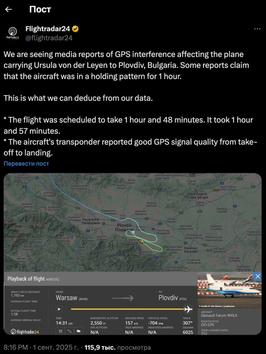 Веб-сервис Flightradar опроверг информацию о сбое в работе GPS у самолета, летевшего в Болгарию, на борту которого находилась председатель Еврокомиссии Урсула фон дер Ляйен Рейс с Урсулой фон дер Ляйен на борту передавал хорошее качество [сигнала] от взлета до посадки Flightradar также прокомментировал информацию о том, что самолет провел в воздухе около часа перед посадкой, заявив, что полет продлился 1 час и 57 минут с изначальным графиком в 1 час и 48 минут Ранее британская газета Financial Times сообщала о сбое в работе системы навигации при посадке самолета с главой ЕК в Болгарии По ее информации, пилотам якобы пришлось использовать бумажные карты для совершения посадки в аэропорту города Пловдив потому что Россия глушила сигнал GPS её самолета @imaxai Подписаться