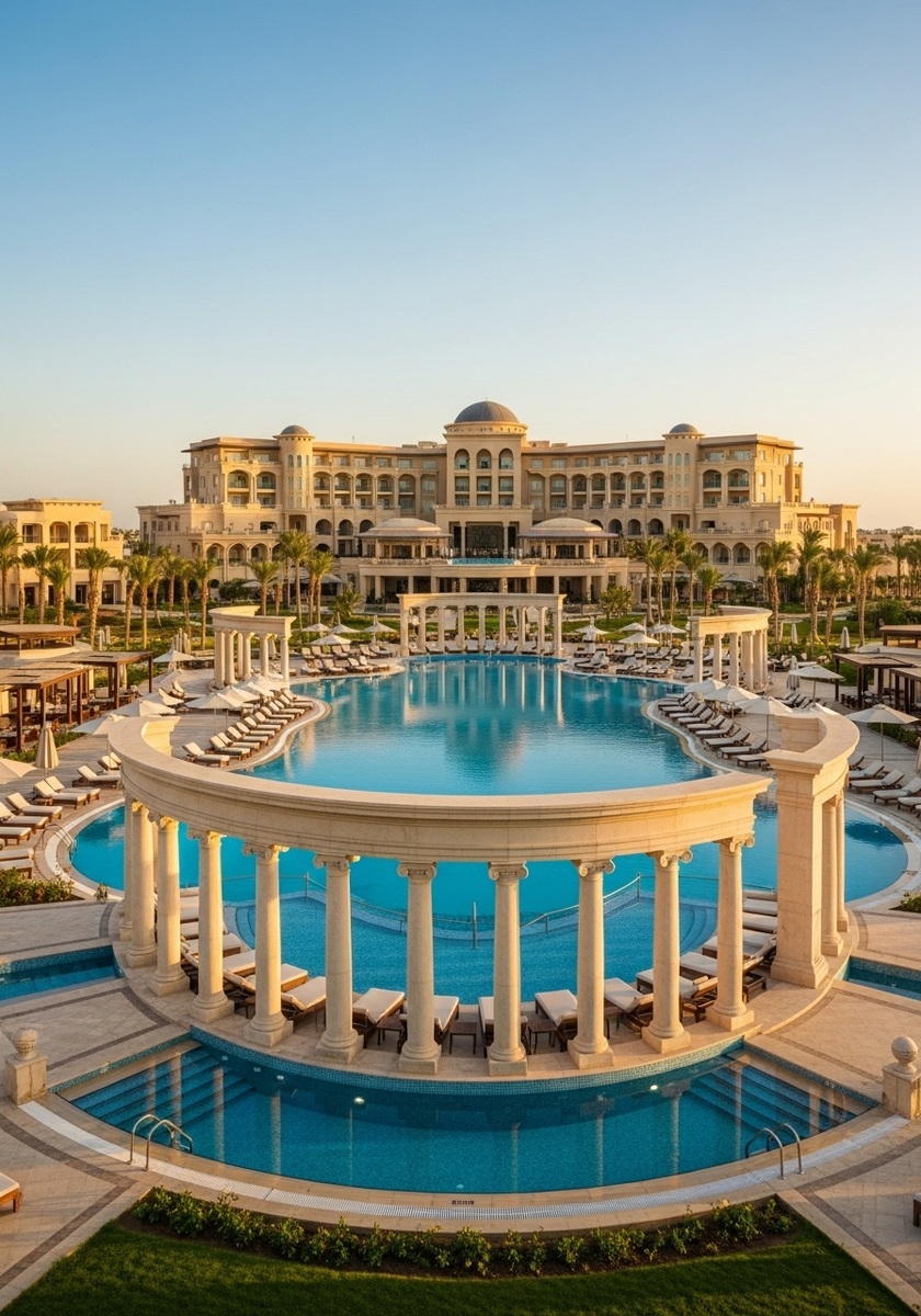 Роскошный курорт, вдохновленный архитектурой арабских дворцов, занимает территорию более 600 кв.м частного песчаного пляжа. Отель состоит из трех кластеров: семейного, только для взрослых и винно-гастрономического. Расположение в самом сердце залива Сахл-Хашиш обеспечивает потрясающие виды на Красное море.