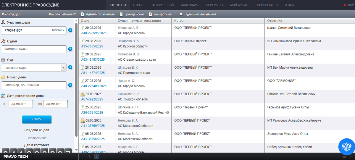 По состоянию на сентябрь 2025 года согласно картотеки арбитражных дел ( kad. арбитраж.ru /) подано более 45 дел.