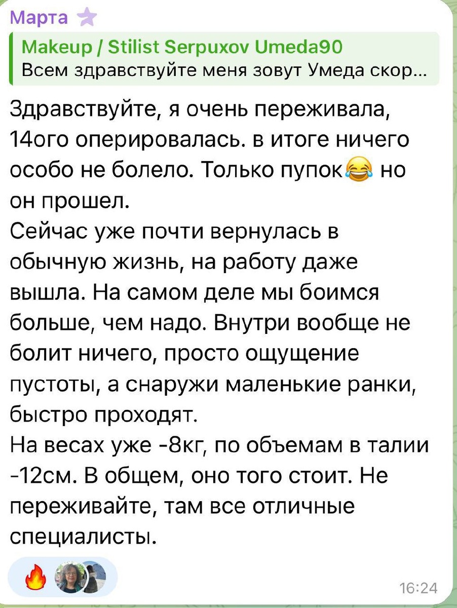 Тяжелое восстановление после баритарии — это миф 🧐 Посмотрите на опыт наших пациентов: уже в первые часы после операции состояние пациентов позволяет ходить, работать и радоваться началу новой жизни без ожирения. Самое тяжелое в восстановлении после операции — это два пункта: 1️⃣Тревога из-за любых сигналов тела. Тянет в районе пупка — это нормально? Нормально, что мне тяжело пить воду? Почему перестал нравится любимый продукт? А как быстро должны заживать швы? Чтобы пациент не пугался из-за малейшего дискомфорта, который, конечно, сопровождает процесс восстановления, важно давать полную и понятную информацию о том, как идет восстановление. И быть с пациентом на связи. Отчасти, для этого я и создал курс «Мое новое тело». Чтобы вы знали, что с вами происходит. И знали, какие ощущения в теле — норма восстановления, а что требует немедленного обращения к врачу. 2️⃣Изменение пищевых привычек. Я сказал об этом уже миллион раз и повторю столько же. Ваш главный враг в процессе восста