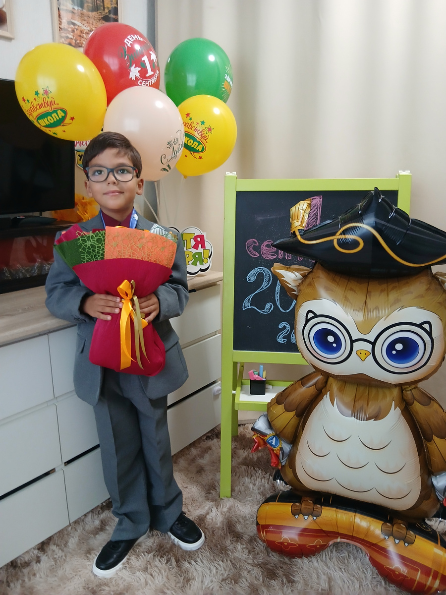 Подъем был ранний в 6 утра. С 8 до 8.30 нам надо было сбегать с Егором сдать анализы. Так что побежали пораньше, что-бы быть первыми, не успели, были вторыми :)))) Все сдали, прибежали домой, закинула уже приготовленные конвертики в аэрогриль, достала тортик, всех подняла, поздравила, накормила. Собрала Егорку, сфотографировала. И побежали в школу. Успела сфотографировать ученика перед школой. Как по заказу утро этого дня было теплым и солнечным, что для нашего района редкость. Детей повели на линейку, родителей в зал пускали по пригласительным, один билет на семью. Я естественно свой забыла :))) На входе по примеру кота Матроскина предъявила фото первоклассника на телефоне и пиджак :))) Пропустили :))) Линейка была наискучнейшая. Егор очень обрадовался, когда узнал, что следующей линейки еще долго не будет. Во время линейки позвонила домой, шепотом напомнила Руське не забыть на комоде букет и конфеты, и попросила его передать девочкам, что-бы они тоже начали собираться. После линейки
