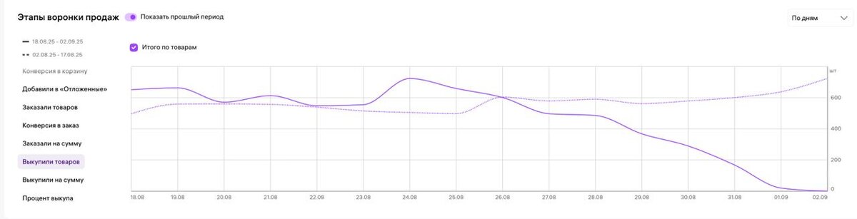 5 магазинов от 1 млн в день. Везде падение кол-во выкупов товаров.