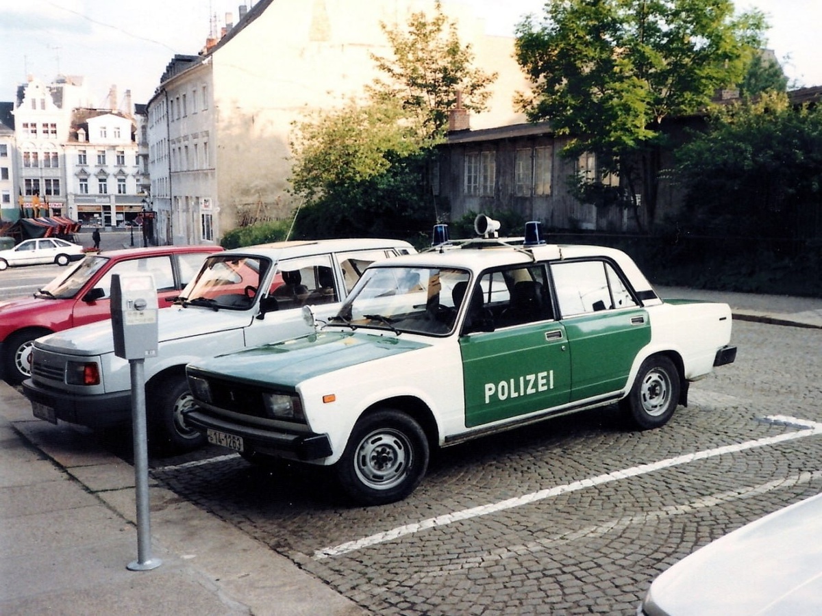 «Жигули» немецкой полиции, город Плауэн, 1991 год. После объединения Германии советские машины, работавшие в народной полиции ГДР, перекрасили в новые цвета, и отправили нести службу вместе с «Мерседесами» и «Фольксвагенами»