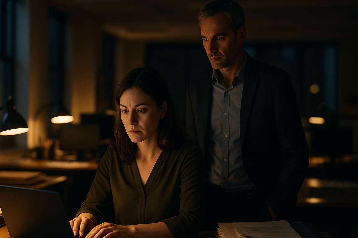 Их история началась год назад. Всё выглядело банально: срочный проект, завал с отчётами. Елена сидела допоздна, бумаги громоздились стопками, и казалось, что конца не будет. Алексей подошёл, сел рядом.