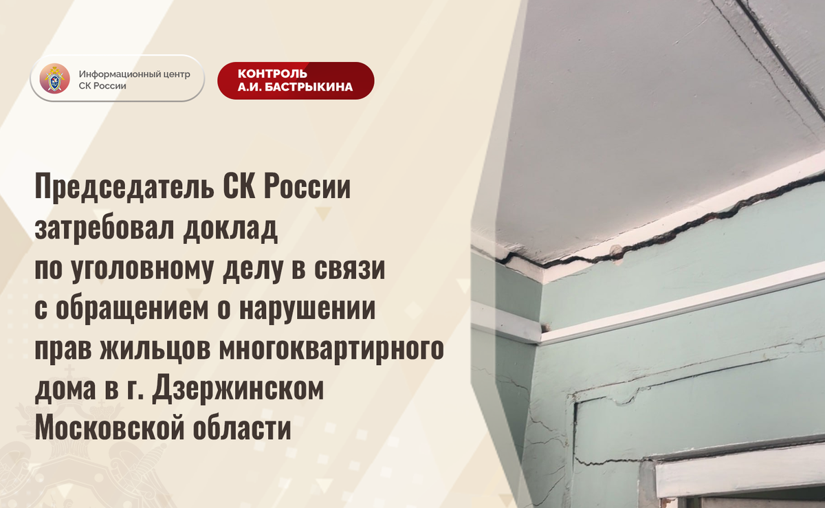 Председатель СК России затребовал доклад по уголовному делу в связи с обращением о нарушении прав жильцов многоквартирного дома в г. Дзержинском Московской области К Председателю СК России А.И. Бастрыкину через Информационный центр обратилась жительница Московской области по вопросу нарушения прав жильцов многоквартирного дома на улице Академика Жукова города Дзержинского. Здание 1987 года постройки находится в непригодном состоянии: кровля повреждена и протекает, в стенах образовались трещины. Несмотря на значительный физический износ конструкций строения, мер к признанию его аварийным не принимается. Многочисленные обращения в различные инстанции результатов не принесли. В ГСУ СК России по Московской области по данному факту расследуется уголовное дело. Председатель Следственного комитета Российской Федерации Александр Иванович Бастрыкин затребовал у руководителя ГСУ СК России по Московской области Ярослава Александровича Яковлева доклад о предварительных и окончательных результатах