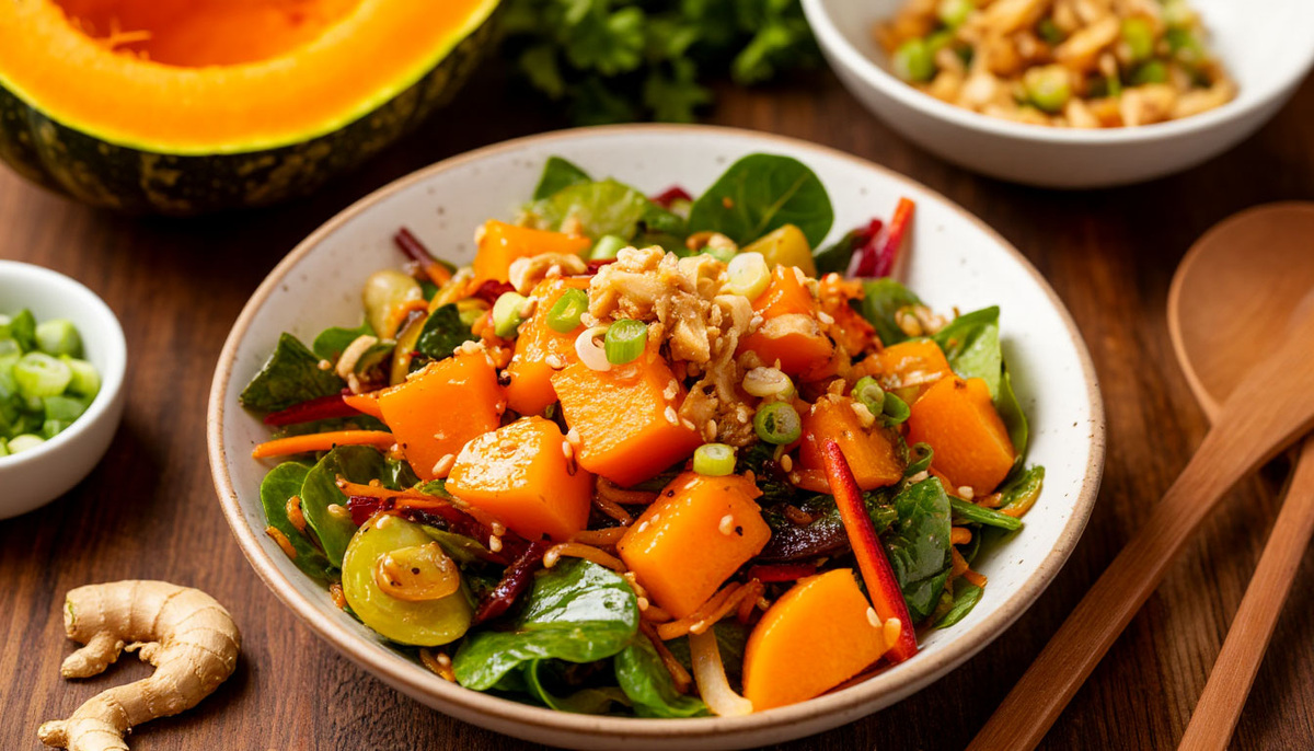 Сентябрь – прекрасное время для кулинарных экспериментов с сезонными овощами. Предлагаем вашему вниманию простой и яркий рецепт азиатского салата с тыквой, который станет отличным дополнением к вашему осеннему столу. Это блюдо сочетает в себе сладковатый вкус тыквы, пикантность имбиря и свежесть зелени. Ингредиенты: Тыква (мускатная или обычная) – 500 г