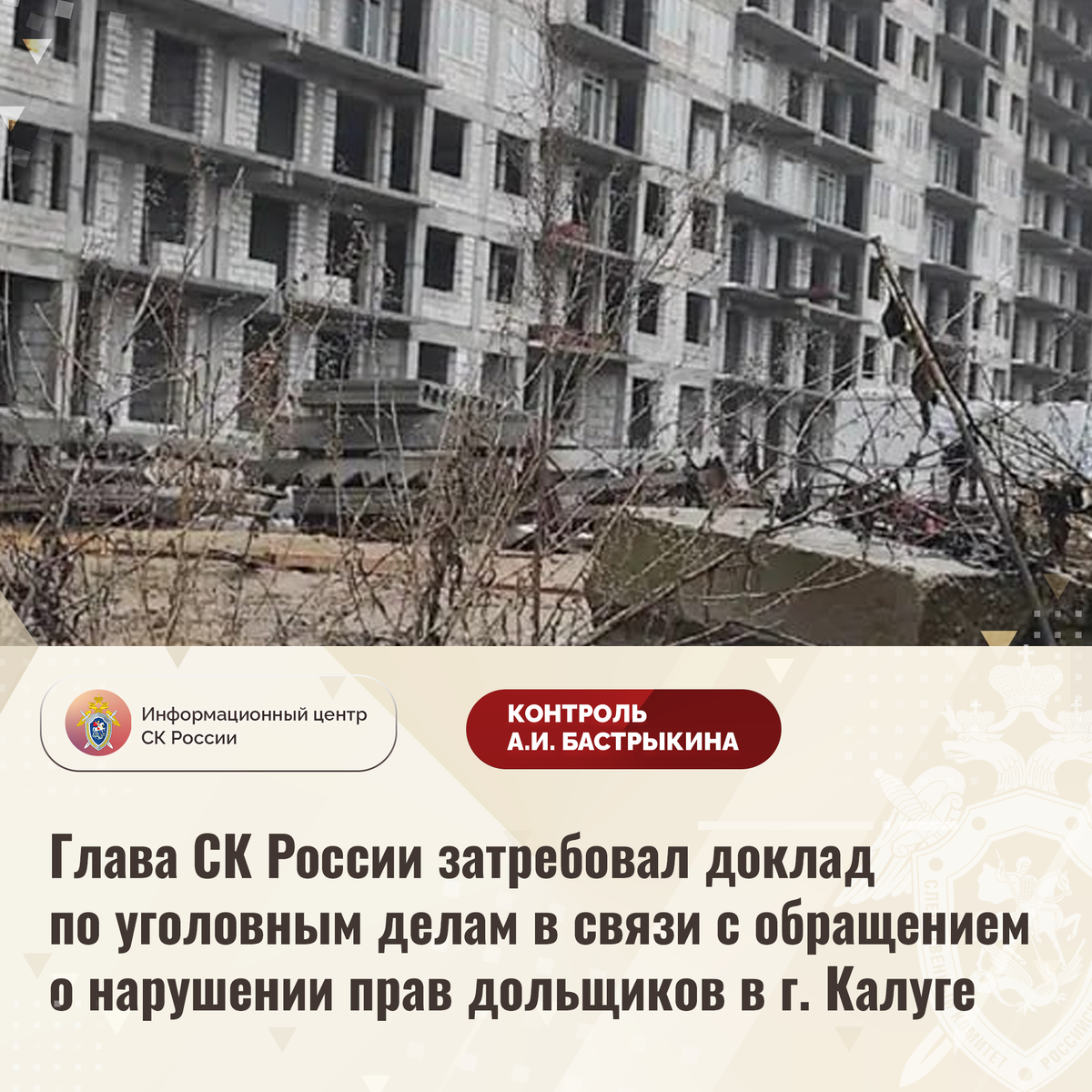 Глава СК России затребовал доклад по уголовным делам в связи с обращением о нарушении прав дольщиков в г. Калуге