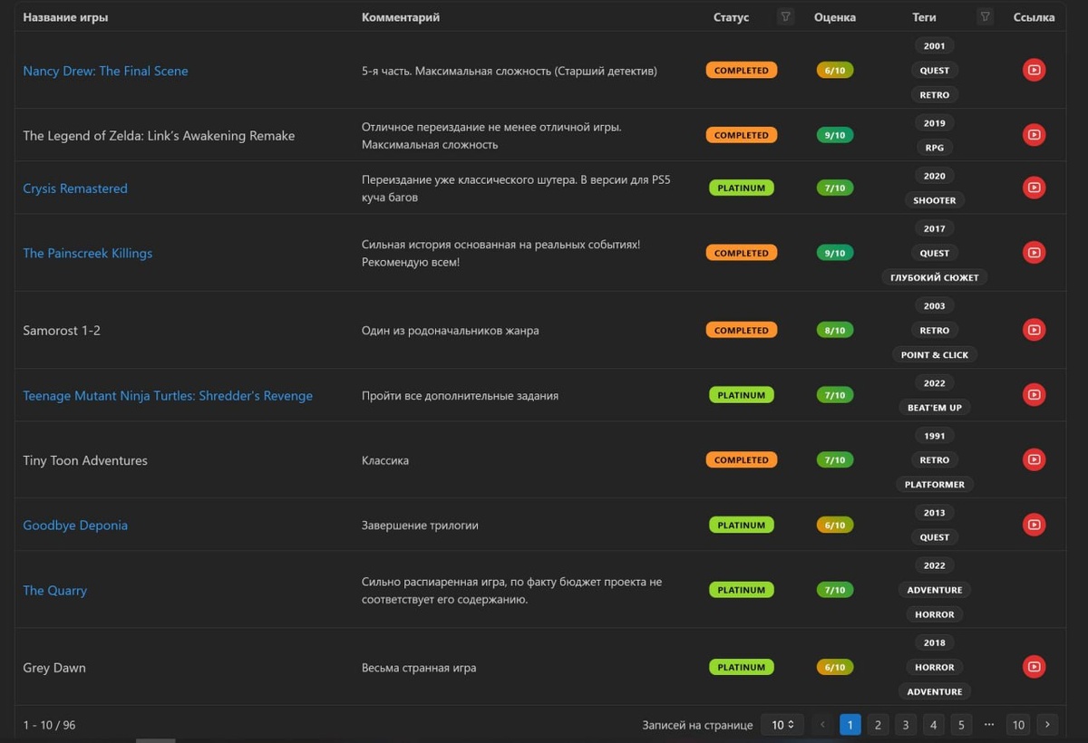 All Games Это своеобразная база данных пройденных игр, кроме жанра "поиск предметов", с оценками, ссылками на видео и дополнительными комментариями. Часть прохождений утеряно/не сохранено. Мы долгое время не могли найти площадку для стримов, сейчас все видео сохраняются как минимум на двух площадках. Если кто-то будет заказывать игру НЕ жанра "поиск предметов", можете использовать эту базу данных для проверки. Хотя возможно кто-то захочет увидеть прохождение игр с новым условием)