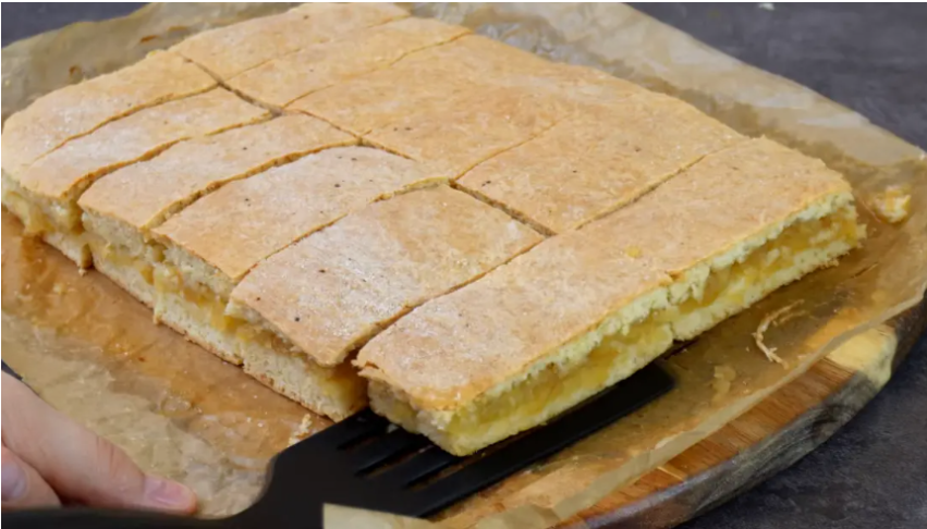 Берем 1 часть теста и раскатываем прямоугольник, по размеру формы. Форму застелем бумагой для выпечки, кладем пласт теста