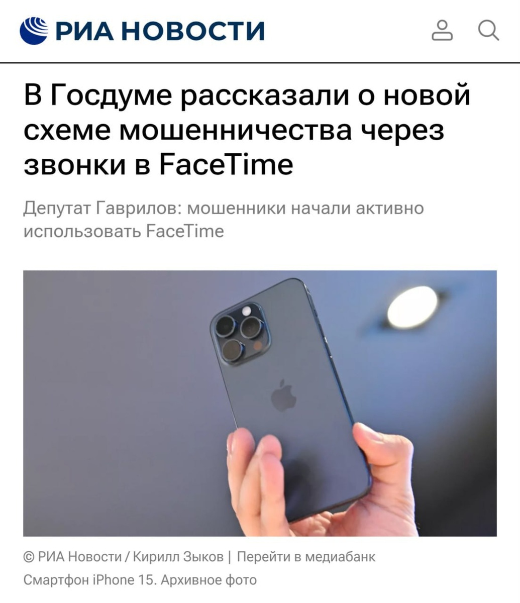 📱 FaceTime могут заблокировать: мошенники добрались и до туда Депутаты Госдумы заявляют, что злоумышленники массово используют FaceTime для обмана: жертву сначала пугают сообщением о "взломе", а затем звонят с камеры и уговаривают включить демонстрацию экрана, чтобы выведать коды из SMS. Никогда такого не было, и вот – опять.